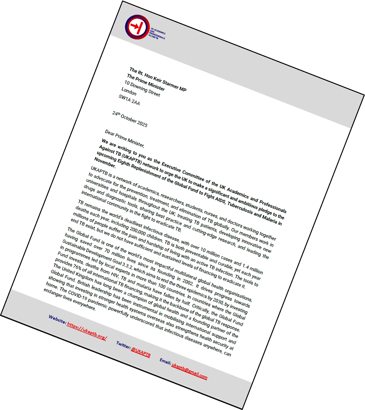 Dr Jess Potter wrote to the UK PM on behalf of UKAPTB to advocate for the UK to make a significant pledge to the 8th replenishment of the Global Fund to fight HIV, TB and Malaria. This funding is critical to continue the work to end TB!